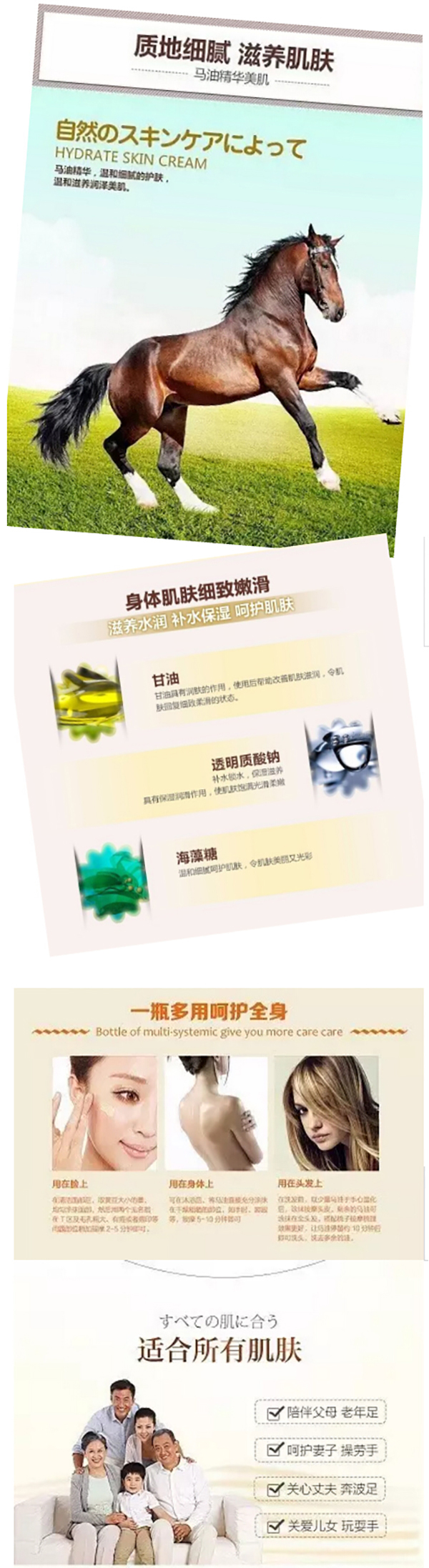 ◆马油介绍:家庭万能药「马油」。马油是压榨,煮沸马的鬃毛,尾巴的根部或是皮下脂肪层的混合物后获取的油脂,再对此油脂进行精炼就获取了马油。它含有丰富的油脂,味美、无臭味,具有卓越的杀菌力,主要是其有强大的渗透力,它可以对人类的肌肤和毛发上的微细孔,以最短的时间渗透,进行杀菌和消毒作用,然后被肌肤细胞转化成营养而吸收。特性:渗透到干燥的肌肤中,赋予肌肤润泽。
